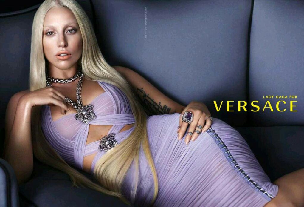 In the “teaser” first photo of the campaign, Gaga looks uncannily like a young Donatella – in a gorgeous, revealing lilac dress and poker straight blonde locks.